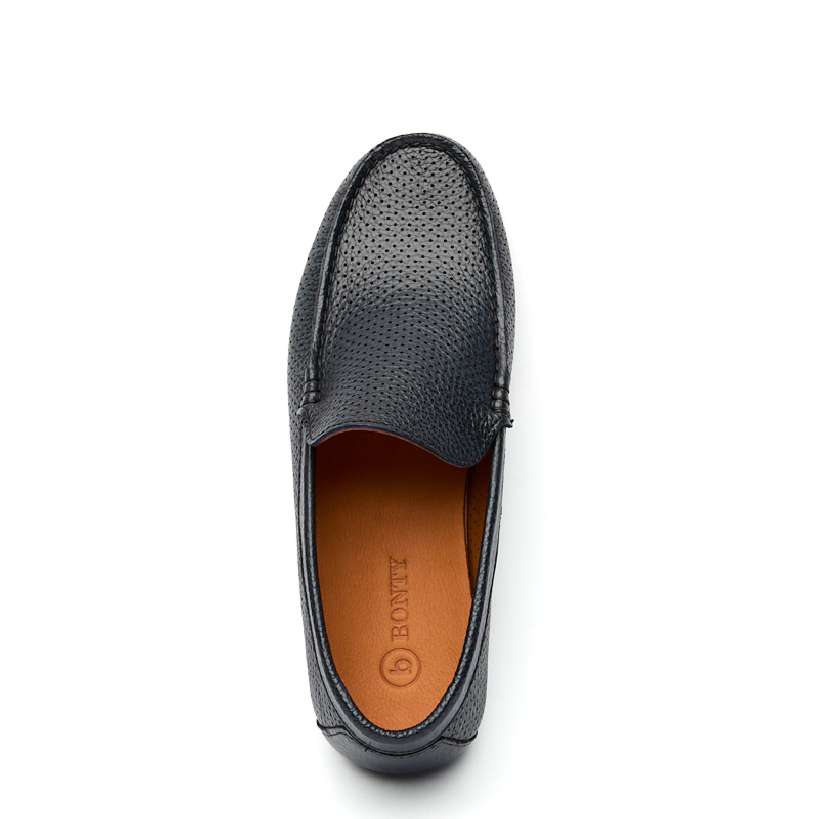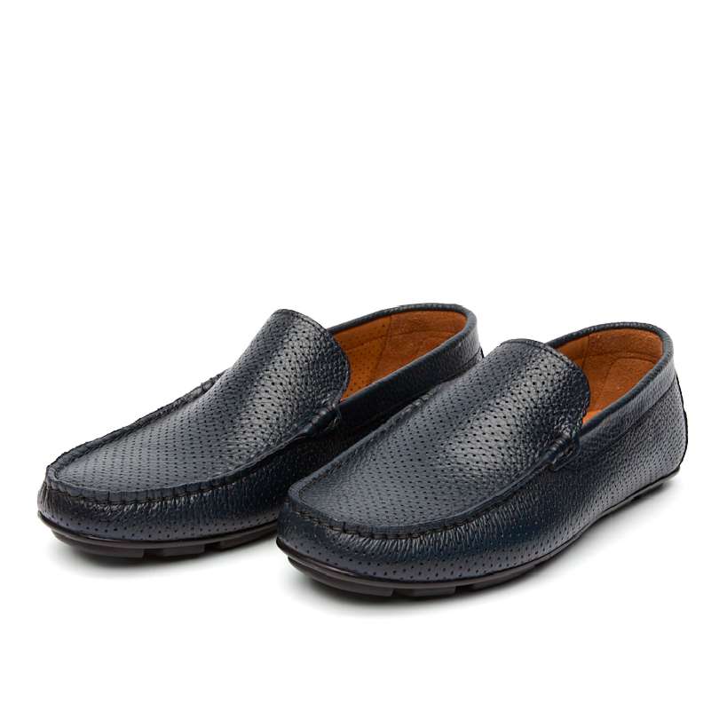 Мужские мокасины с перфорацией. Цвет темно-синий. Мягкая и крепкая турецкая кожа хромового дубления, удобная колодка. Лёгкие - 250 грамм. Для любых стоп, кроме самых узких. Подошва и интегрированный каблук из современного эластомера не скользят, позволяют хорошо чувствовать педали и амортизируют при ходьбе.