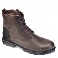 Мужские зимние ботинки на шнурках с меховым подкладом. Цвет темно-коричневый. Из натуральной кожи КРС первой группы качества. Очень удобная колодка. Для любых стоп в пределах ортопедической нормы, кроме самых узких и гипершироких. Утолщённые и мягкие подошва и каблук. Из современного полиуретанового эластомера, долго не стираются, почти не скользят, позволяют хорошо чувствовать педали и амортизируют при ходьбе.