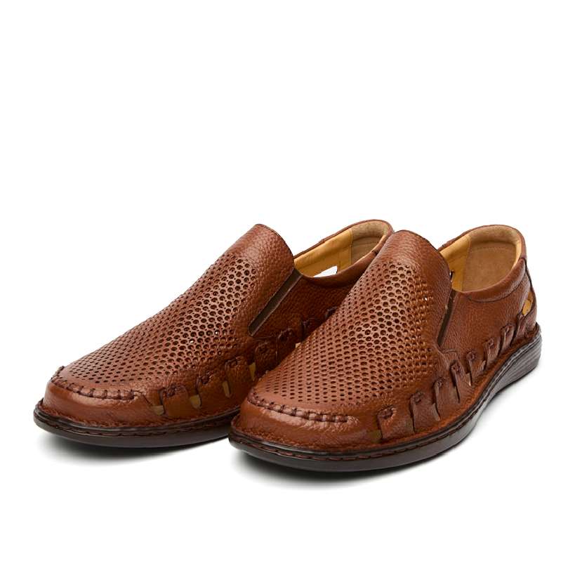 Мужские перфорированные летние туфли, размеры 46-48, коричневые. Очень удобная колодка. Лёгкие - 320 грамм. Для любых стоп в пределах ортопедической нормы, кроме самых узких и гипершироких. Толстые и мягкие подошва и каблук из современного эластомера долго не стираются, почти не скользят, позволяют хорошо чувствовать педали и амортизируют при ходьбе.