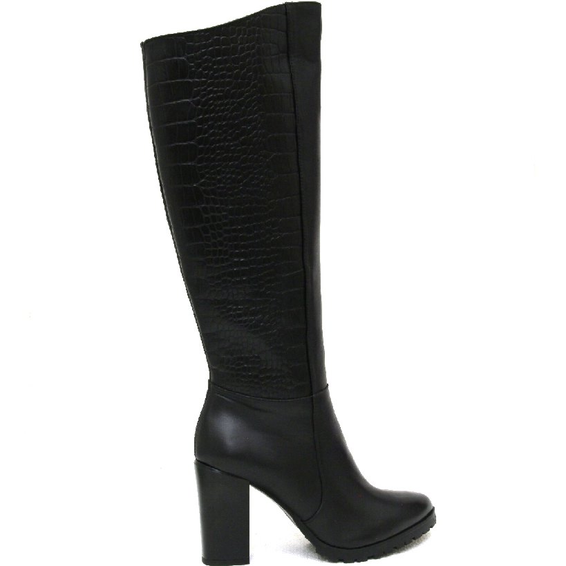 Очень удобные женские чёрные сапоги на евромехе от ООО Бонти - удачная колодка, модное тиснение "аллигатор". Подойдут для икр обхватом до 38 см и для разных подъёмов. Для любых стоп, кроме самых широких. Мягкая упругая подошва не скользит и защищает от холода, прочный толстостенный каблук. В наличии российские размеры от 36 до 39-го.