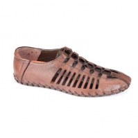 Мужские бежевые перфорированные летние туфли на резинках. Очень удобная колодка. Лёгкие - 250 грамм. Для любых стоп в пределах ортопедической нормы, кроме самых узких и гипершироких. Удачное расположение резинок позволяет с комфортом использовать со стопами с любым подъёмом. Толстые и мягкие подошва и каблук из современного эластомера долго не стираются, почти не скользят, позволяют хорошо чувствовать педали и амортизируют при ходьбе.